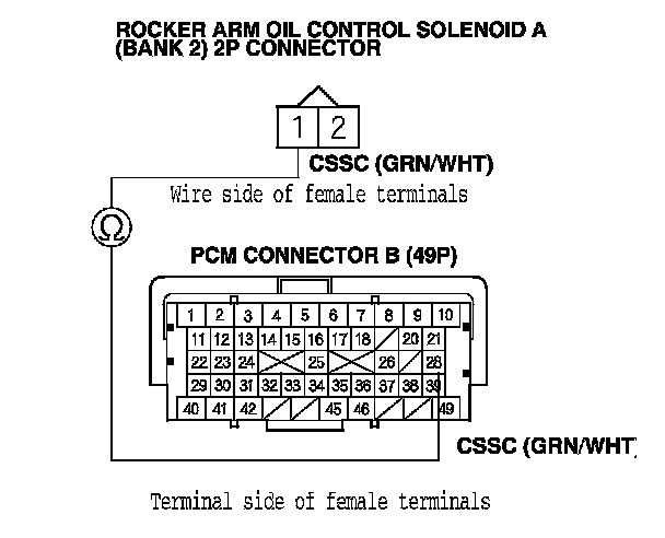 11. Check for continuity between PCM connector terminal B28 and rocker arm oil control solenoid A (Bank 2) 2P connector terminal No. 1.