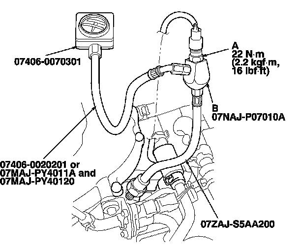 22. Attach the special tools to the rear rocker arm oil control valve as shown, then attach the rear rocker arm oil pressure switch (A) to the pressure gauge adapter (B).