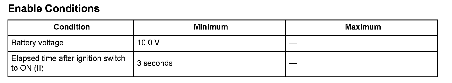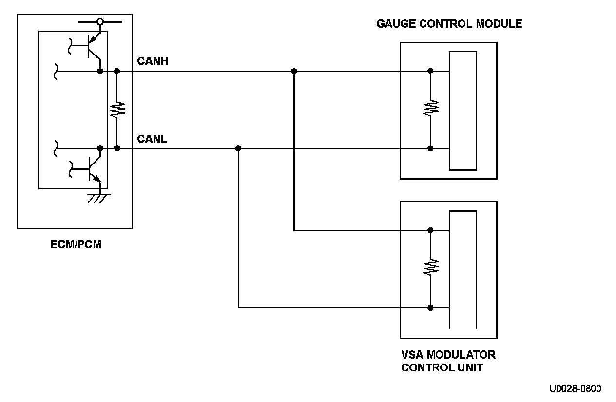 The controller area network (CAN) transmits/receives pulsing signals to/from the control modules simultaneously by using two signal lines (CANH and CANL). When the engine control module (ECM)/powertrain control module (PCM) does not receive the signals via the CAN lines for a set time or more, the ECM/PCM detects a malfunction and a DTC is stored.