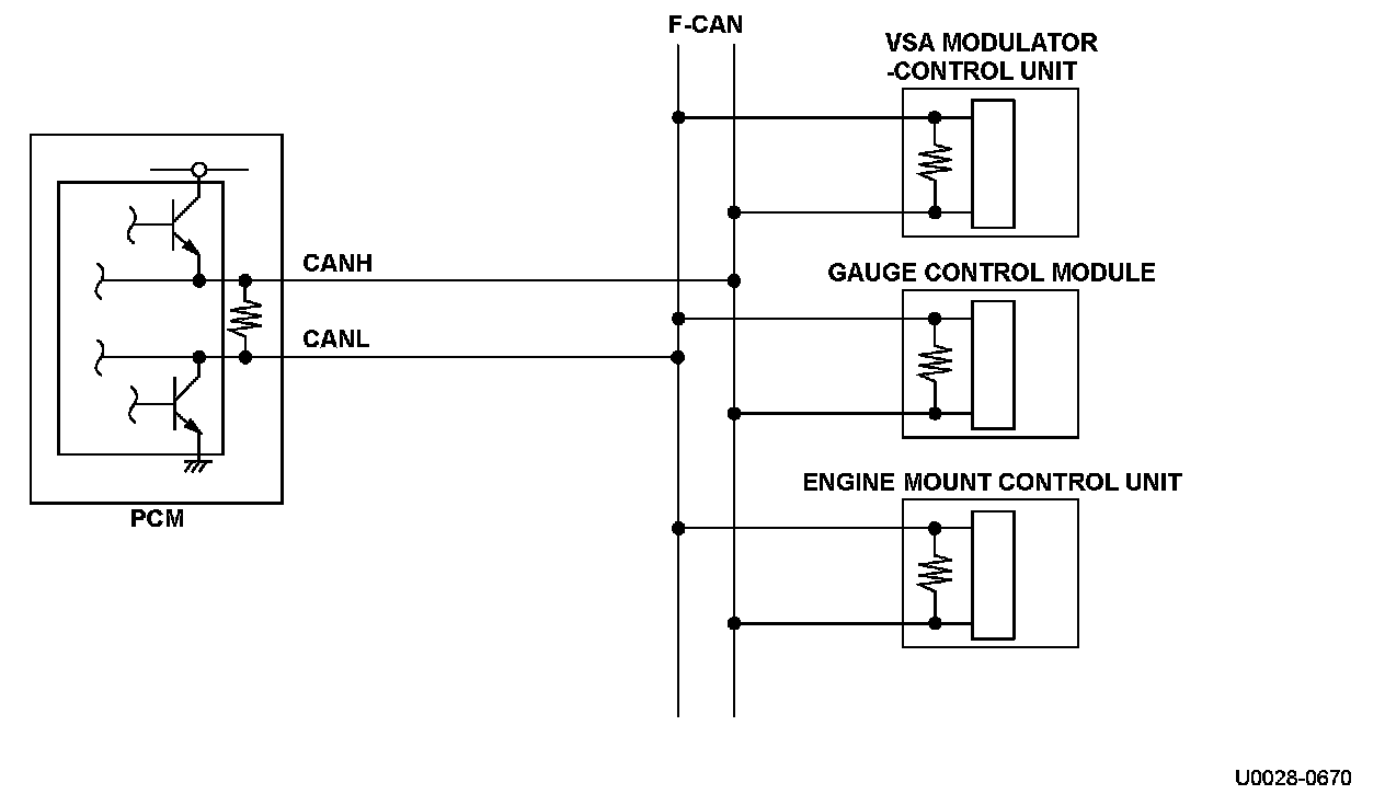 The controller area network (CAN) transmits/receives pulsing signals to/from the control modules simultaneously by using two signal lines (CANH and CANL). When the information is not sent from the powertrain control module (PCM) through the F-CAN and this condition continues for a specified time or when the information sent from the PCM is abnormal and this condition continues for a specified cycle, a DTC is stored.