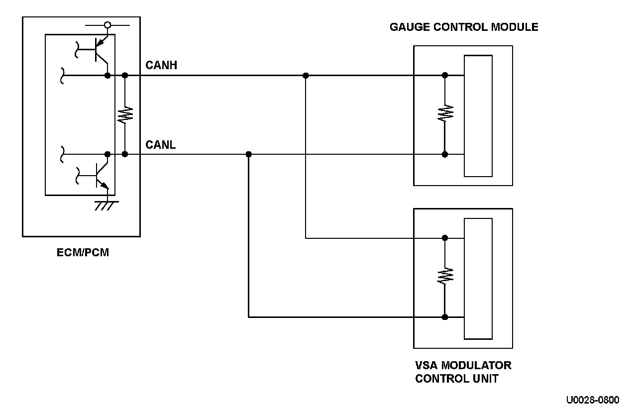 The controller area network (CAN) transmits/receives pulsing signals to/from the control modules simultaneously by using two signal lines (CANH and CANL). When the engine control module (ECM)/powertrain control module (PCM) does not receive the signals via the CAN lines for a set time or more, the ECM/PCM detects a malfunction and a DTC is stored.