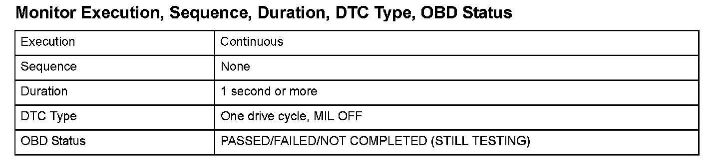 Monitor Execution, Sequence, Duration, DTC Type, OBD Status