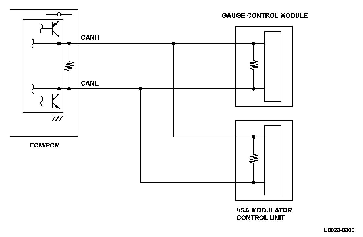 The controller area network (CAN) transmits/receives pulsing signals to/from the control modules simultaneously by using two signal lines (CANH and CANL). When the engine control module (ECM)/powertrain control module (PCM) does not receive the signals from the gauge control module via the CAN lines for more than a set time, the ECM/PCM detects a malfunction and a DTC is stored.
