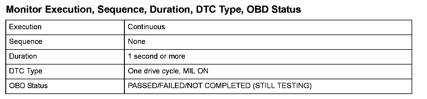 Monitor Execution, Sequence, Duration, DTC Type, OBD Status