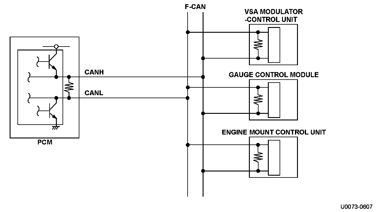 The controller area network (CAN) transmits/receives pulsing signals to/from the control modules simultaneously by using two signal lines (CANH and CANL). When the powertrain control module (PCM) does not receive the signals via the CAN lines for a set time, the PCM detects a malfunction and a DTC is stored.