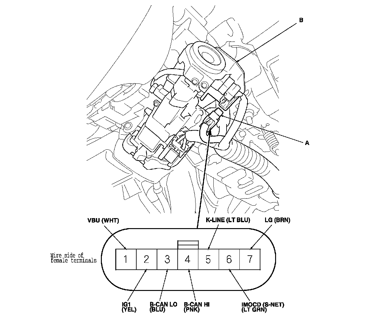 3. Disconnect the 7P connector (A) from the immobilizer-keyless control unit (B).