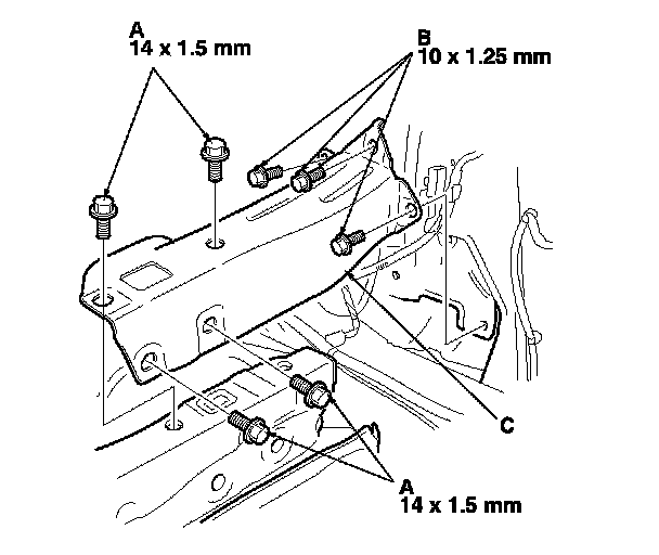 3. Remove the bolts (A, B), then remove the middle cross-member gusset (C).