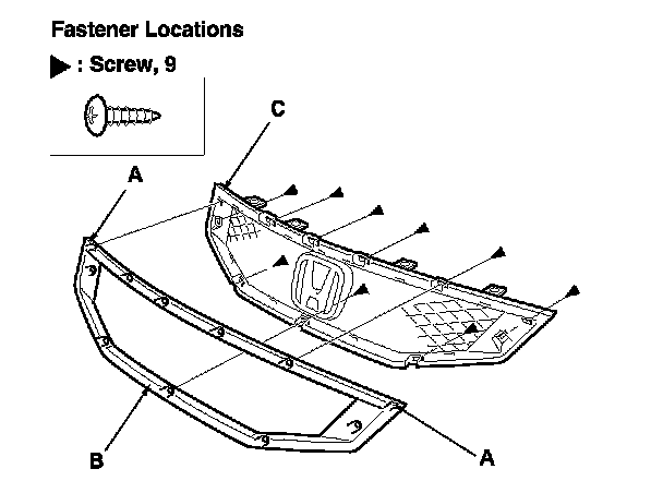 2. From behind the grille, remove the screws, and pry up the two hooks (A) by using a flat-tip screwdriver wrapped with protective tape, then remove the front grille molding (B) from the front grille base (C).