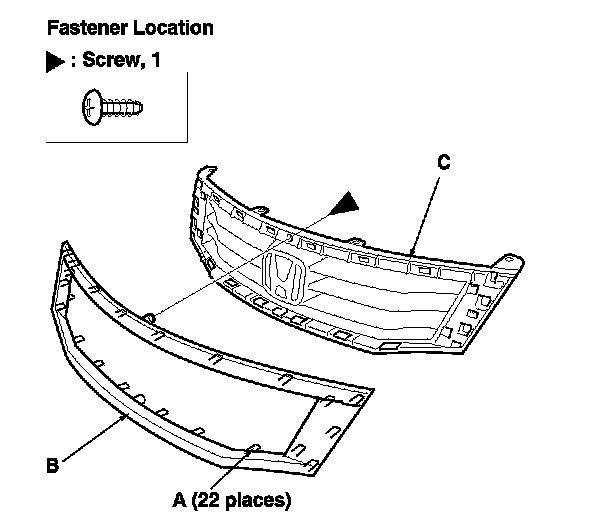 2. From behind the grille, remove the screw, and pry up the hooks (22 places) (A) by using a flat-tip screwdriver wrapped with protective tape, then remove the front grille molding (B) from the front grille base (C).