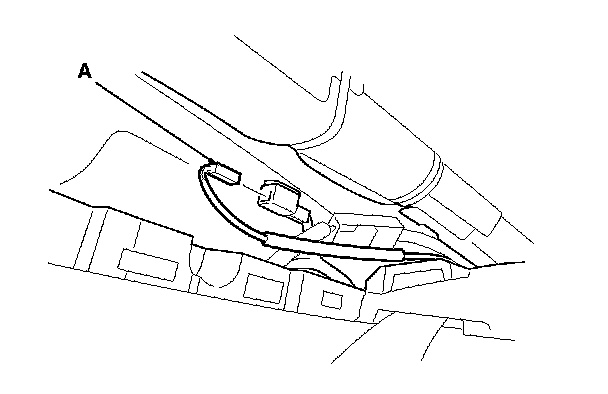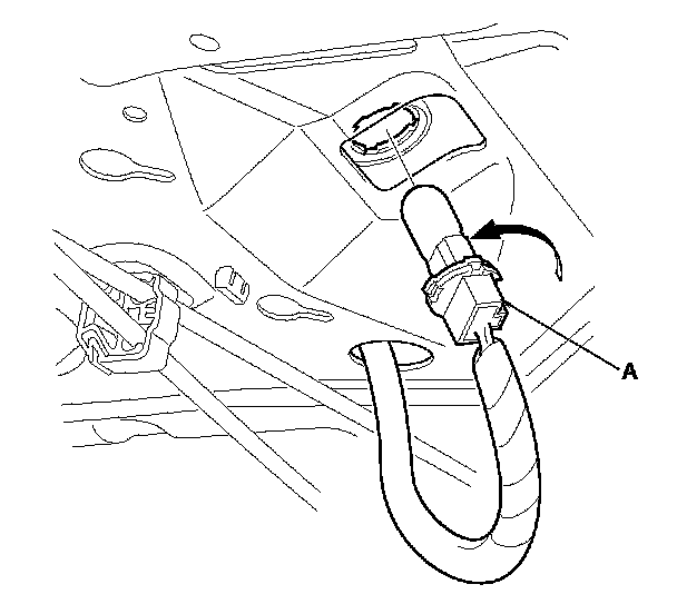 2. From the trunk compartment, turn the high mount brake light socket (A) 45 ° counterclockwise to remove the socket. 4-door is shown; 2-door is similar.