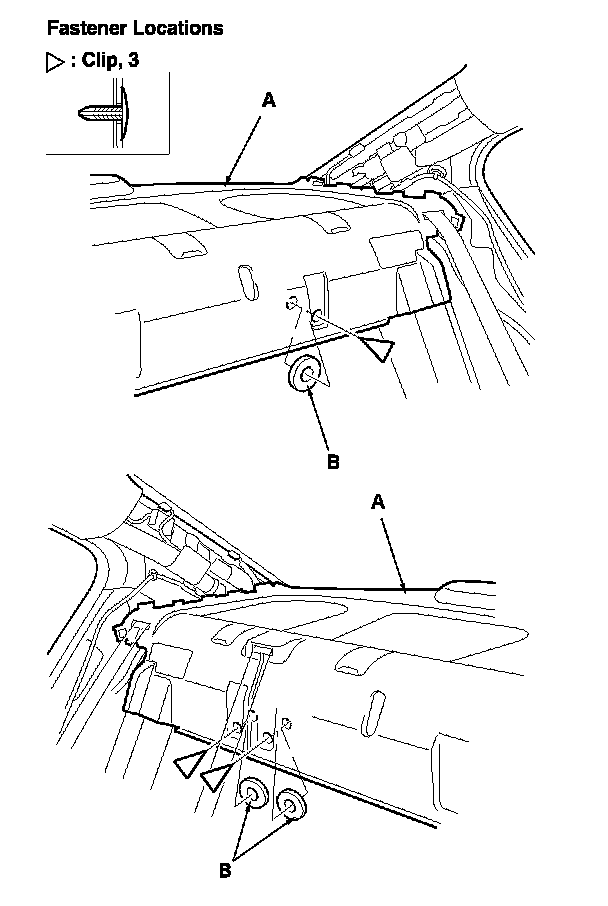 4. Remove the clips securing the rear shelf (A), and remove the washers (B) from between the rear shelf and body. 4-door is shown; 2-door is similar.