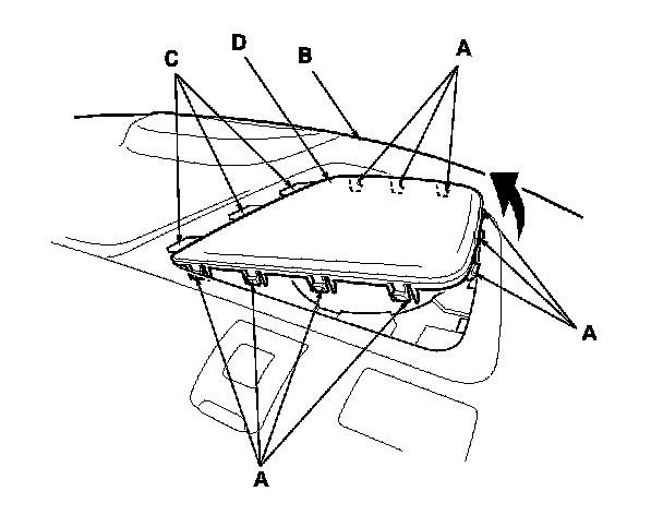 6. Detach the hooks (A) from under the rear shelf (B), and release the hooks (C), then remove the rear speaker grille (D). The left side is shown; the right side is symmetrical.