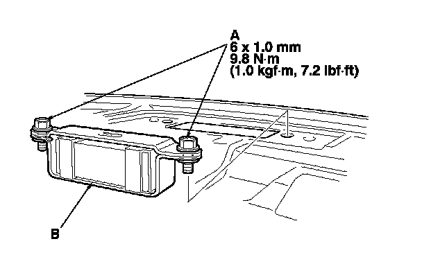 2. Remove the bolts (A), then remove the rear parcel shelf dynamic damper (B). Take care not to hit the rear window when removing the bolts.