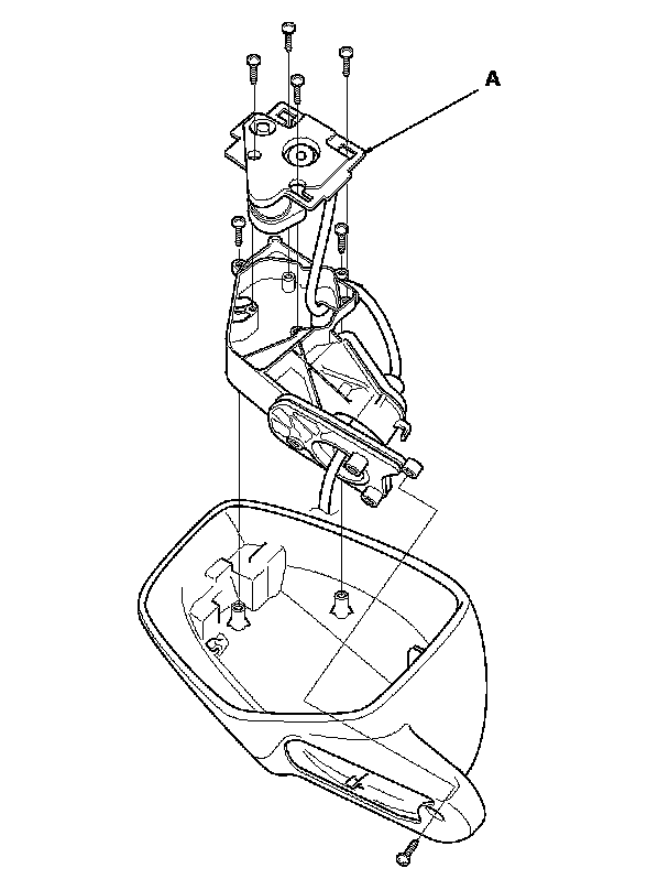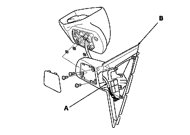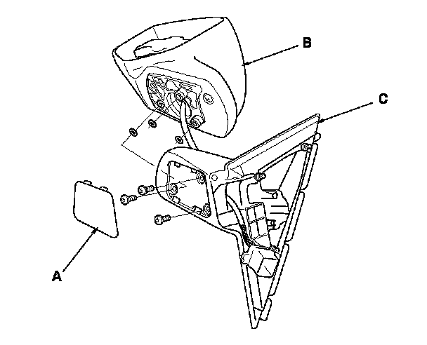 8. Remove the three screws, and separate the mirror housing (B) from the bracket (C).