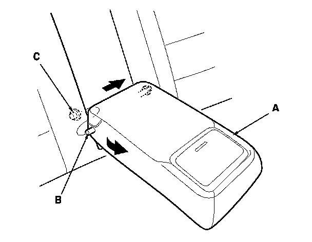 6. Slide the armrest (A) toward the driver's side of the vehicle, and remove the pivot shaft (B) from the collar (C) on the right side of the vehicle by pulling back on the armrest.