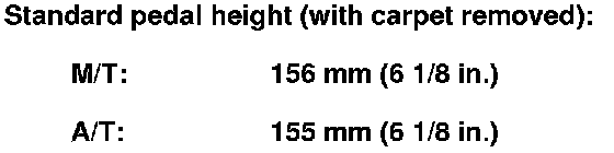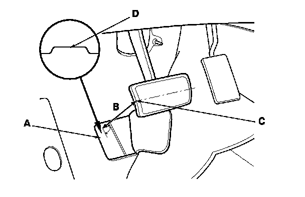 4. Pull back the carpet, and find the cutout (A) in the insulator. Measure the pedal height (B) from left side middle of the pedal pad (C) to the floor (D) without the insulator as shown.