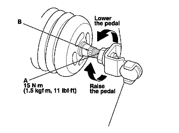 6. Lift up on the brake pedal by hand. Push in the brake pedal position switch until its plunger is fully pressed (threaded end (A) touching the pad (B) on the pedal arm). Turn the switch 45 ° clockwise to lock it. The gap between the brake pedal position switch and the pad is automatically adjusted to 0.7 mm (0.028 in.) by locking the switch. Make sure the brake lights go off when the pedal is released.