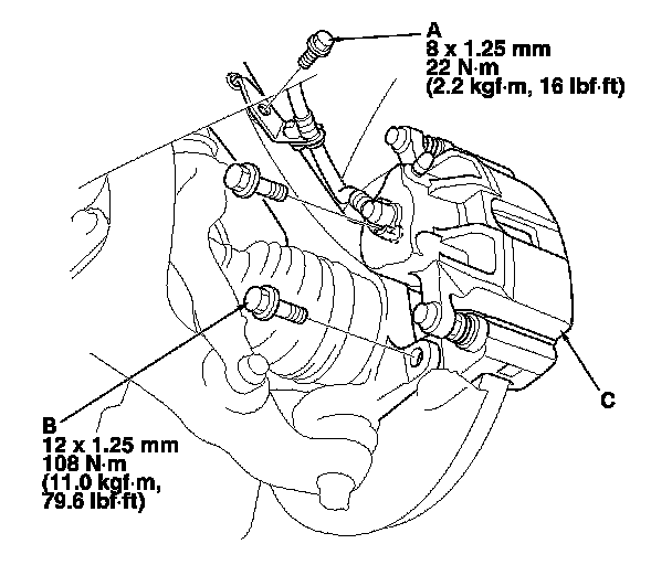 4. Remove the brake caliper bracket mounting bolts (B), then remove the caliper assembly (C) from the knuckle. To prevent damage to the caliper assembly or brake hose, use a short piece of wire to hang the caliper assembly from the undercarriage. Do not twist the brake hose excessively.