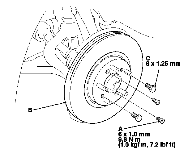 NOTE: If the brake disc is stuck to the front hub, thread two 8 x 1.25 mm bolts (C) into the brake disc to push it away from the front hub. Turn each bolt 90 degrees at a time to prevent the brake disc from binding.