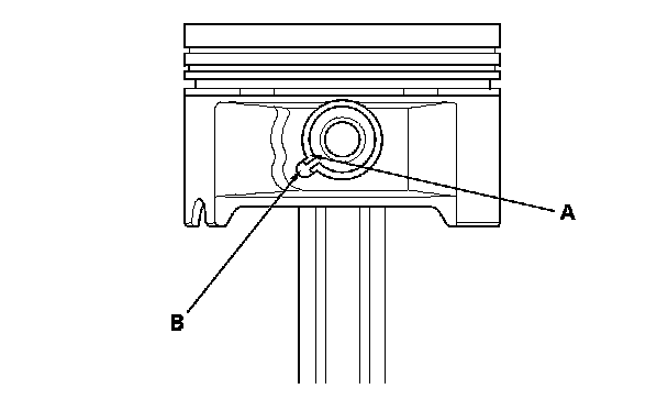 2. Apply new engine oil to the piston pin snap rings (A) and turn them in the ring grooves until the end gaps are lined up with the cutouts in the piston pin bores (B).