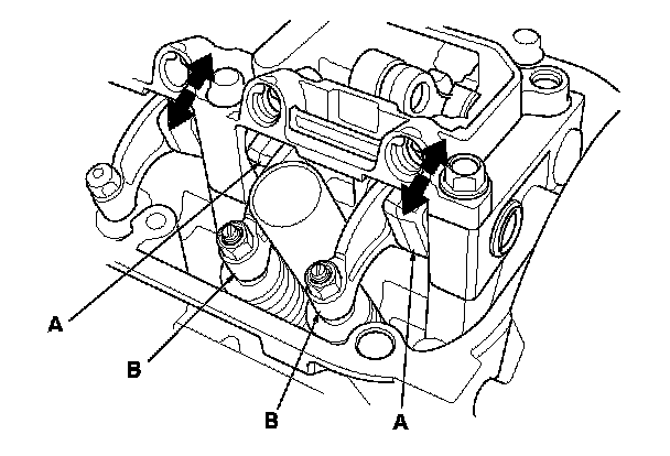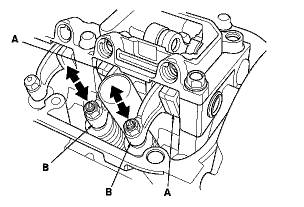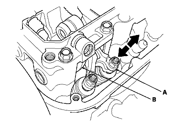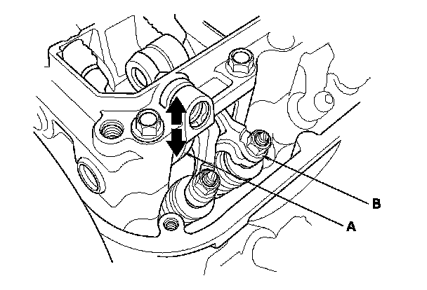 11. With the specified air pressure applied, rotate the crankshaft pulley clockwise. The intake secondary rocker arm (A) move independently of the intake primary rocker arm (B).