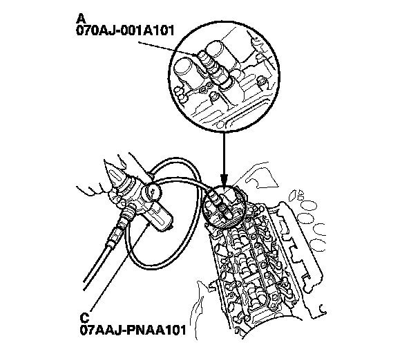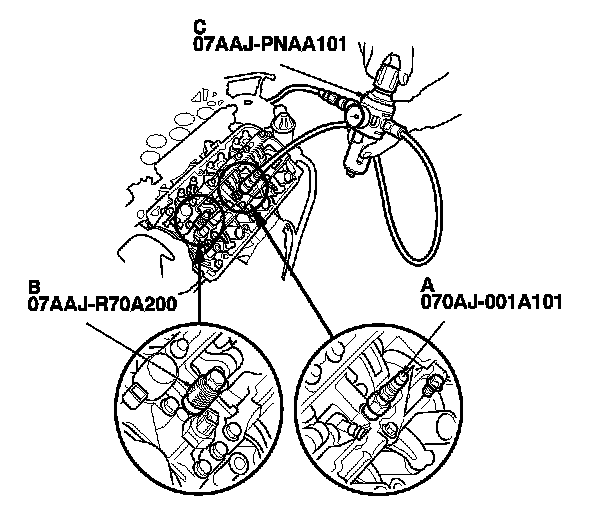 9. Remove the sealing bolt, then install the VTEC/VCM air adapter (A) to the inspection hole and install the VTEC air stop tool B (B), then connect the air pressure regulator (C) as shown.