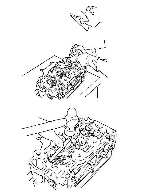 5. Working from the camshaft side, use the driver and an air hammer to drive the guide about 2 mm (0.1 in.) towards the combustion chamber. This will knock off some of the carbon and make removal easier. Hold the air hammer directly in line with the valve guide to prevent damaging the driver. Wear safety goggles or a face shield.