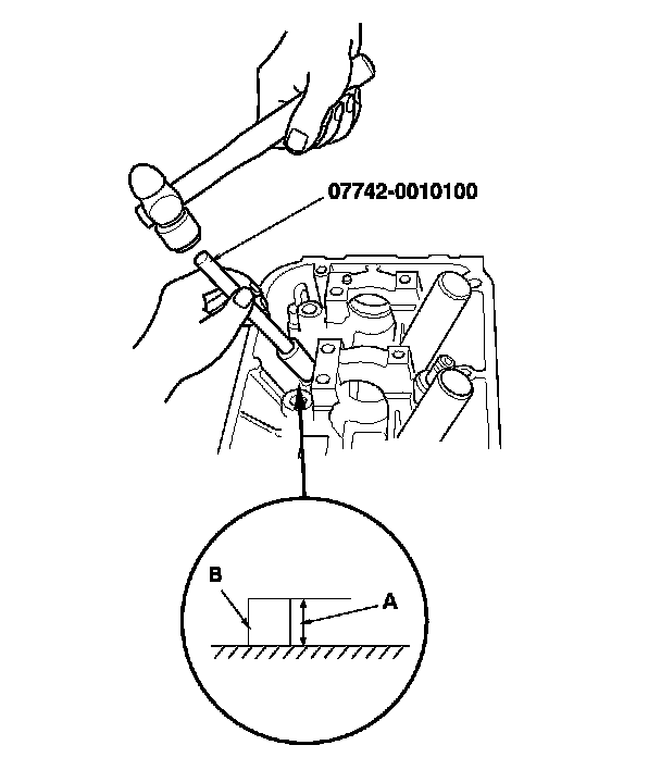 9. Apply a thin coat of new engine oil to the outside of the new valve guide. Install the guide from the camshaft side of the head; use the valve guide driver to drive the guide to the specified installed height (A) of the guide (B). If you have all 12 guides to do, you may have to reheat the head.