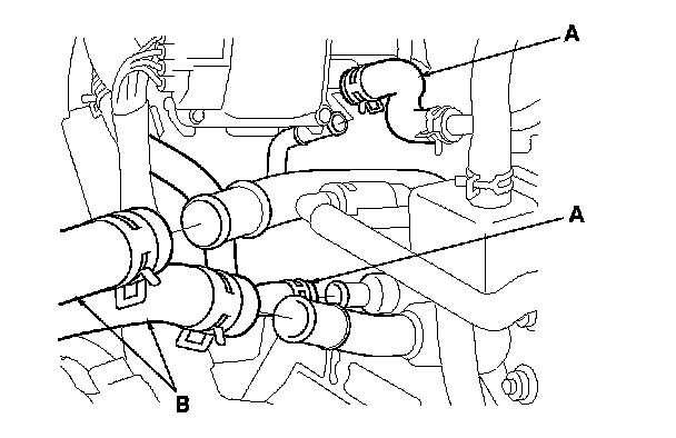 5. Disconnect the water bypass hoses (A) and the heater hoses (B).