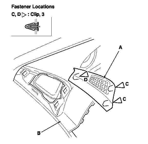 1. Insert the appropriate trim tool into a gap between the side defogger vent trim (A) and the driver's outer middle pad (B), and detach the lower clips (C).