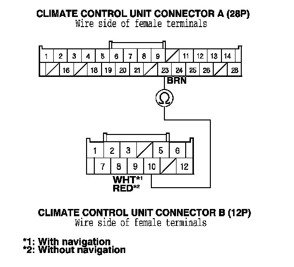 15. Measure the evaporator temperature sensor resistance between the climate control unit connector A (28P) No. 23 terminal and the connector B (12P) No. 10 terminal.