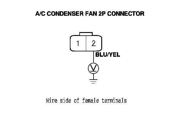 20. Measure the voltage between the A/C condenser fan 2P connector No. 2 terminal and body ground.