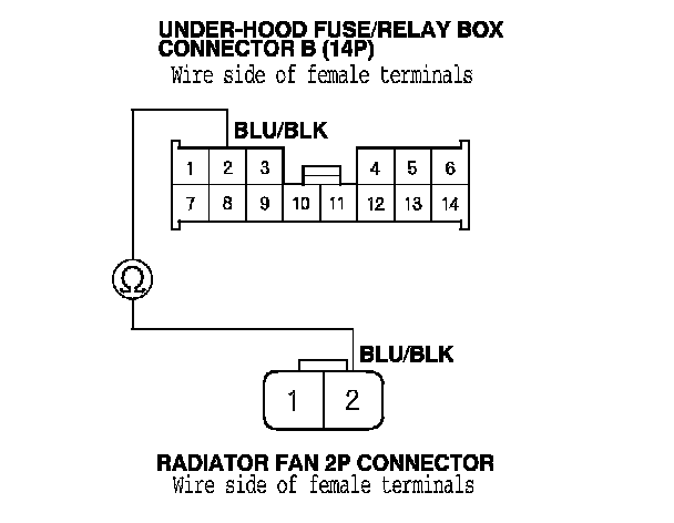 33. Check for continuity between under-hood fuse/relay box connector B (14P) No. 2 terminal and the radiator fan 2P connector No. 2 terminal.