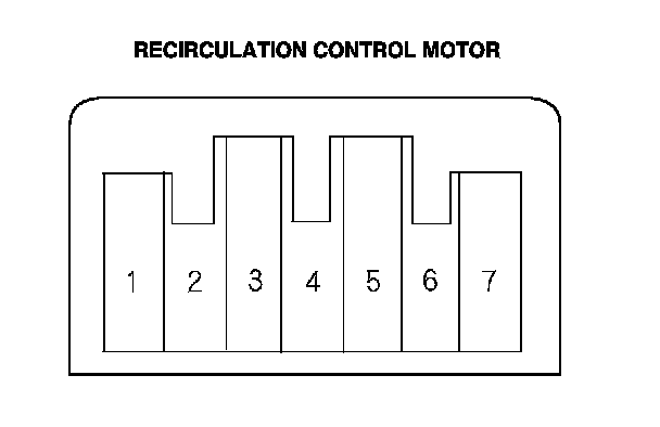2. Connect battery power to the No. 1 terminal of the recirculation control motor, and ground either the No. 5 or No. 7 terminals; the recirculation control motor should run smoothly. To avoid damaging the recirculation control motor, do not reverse power and ground. Disconnect the No. 5 or No. 7 terminal from ground immediately when the motor stops running; the recirculation control motor should stop at Fresh (when the No. 7 terminal is disconnected) or Recirculate (when the No. 5 terminal is disconnected). Do not leave the motor connected to power and ground for long periods of time.