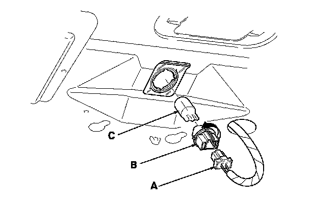 3. Turn the bulb socket (B) 45 ° counterclockwise to remove the bulb (C).