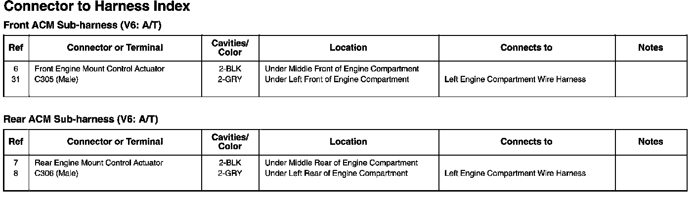 Left Engine Compartment Wire Harness, ACM Sub-harnesses, Left Fog Light Sub-harness Connector and Harness Locations