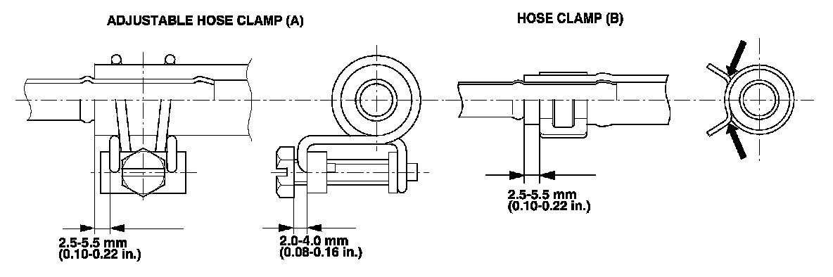 - Connect each hose to the corresponding line securely until it contacts the stop on the line. Install the clamp or adjustable clamp at the specified distance from the hose end as shown.
