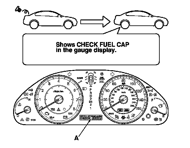 The first time a leak is detected a CHECK FUEL CAP message appears on the gauge display (A). To scroll to another message, press the select/reset button. The "CHECK FUEL CAP" message will appear each time you restart the engine until the system turns the message off. Turn the engine off then replace or tighten the fuel fill cap until it clicks at least once.