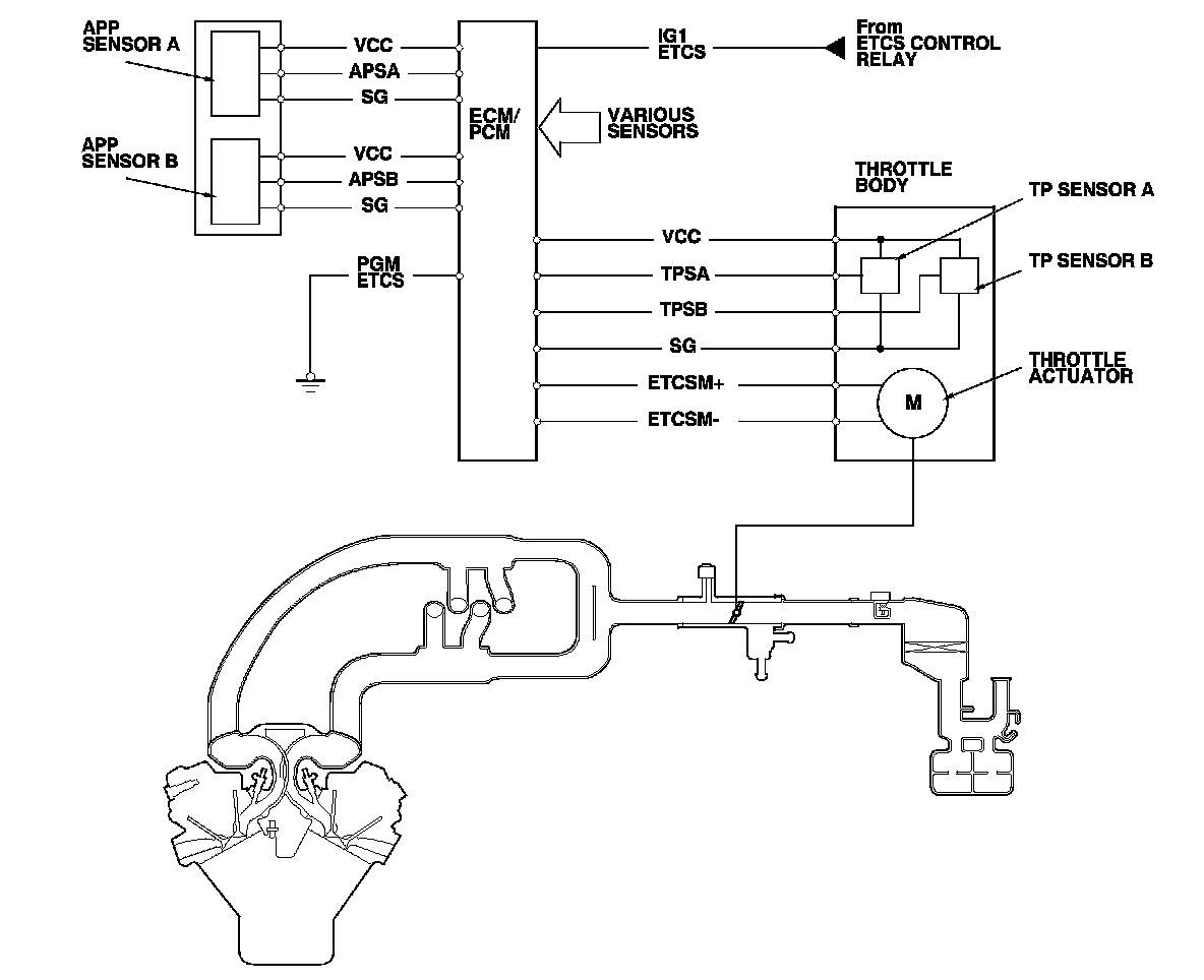 The electronic throttle control system consists of the throttle actuator, throttle position (TP) sensor A/B, accelerator pedal position (APP) sensor A/B, the electronic throttle control system (ETCS) control relay, and the ECM/PCM.