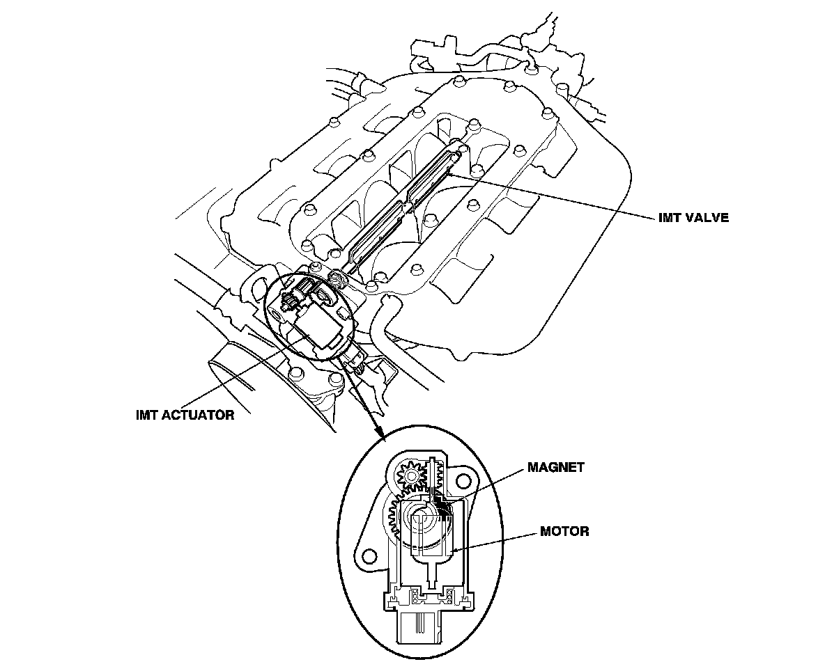 The intake manifold tuning (IMT) actuator contains a sensor that detects the IMT valve position and sends it to the ECM/PCM.