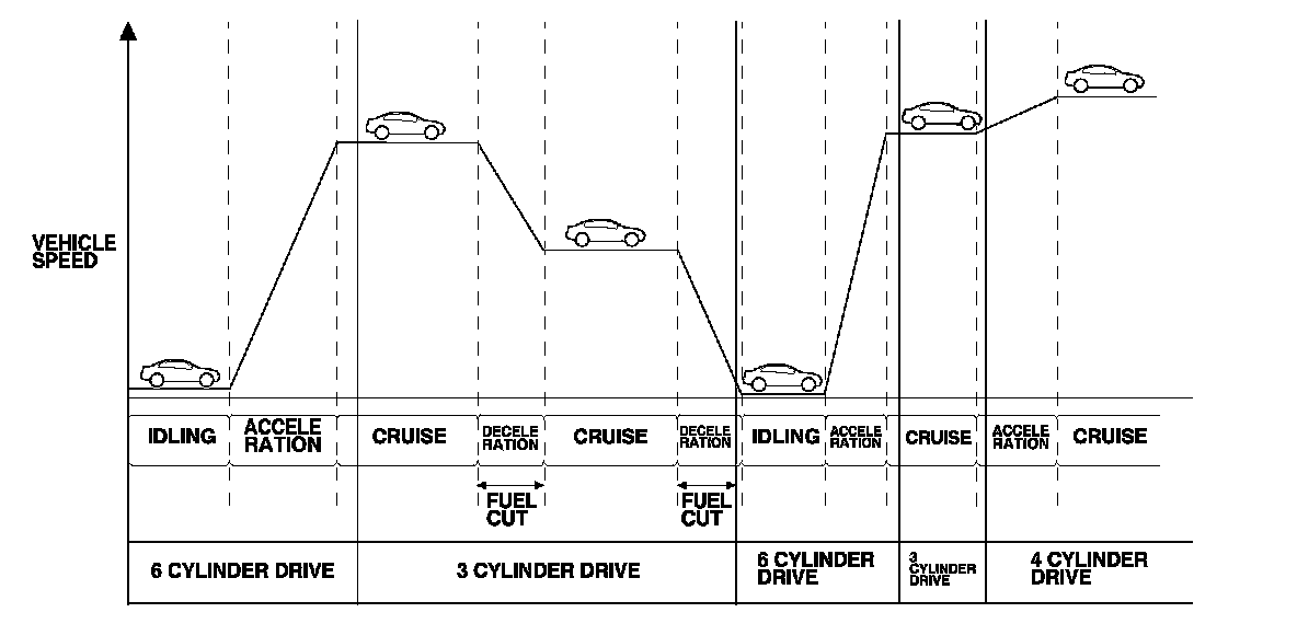 The VCM system activates the cylinders based on the driving condition. The system has three modes: 6 cylinder (all cylinder activation), 4 cylinder (pauses the No. 3 and No. 4 cylinders), and 3 cylinder (pauses the rear bank of cylinders). On paused cylinders, the intake and exhaust valves are kept closed. Since the valves are closed, the frictional losses from the valve spring compression and pumping are reduced because no air is compressed in the cylinder. This reduces engine drag.