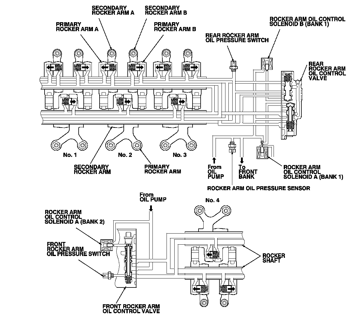 With rocker arm oil control solenoid A (Bank 1) and A (Bank 2) turned on by PCM, the front and rear rocker arm oil control valves switch the oil pressure. Oil pressure then enters the No. 3 and No. 4 cylinder's primary rocker arm from the oil passage in the rocker shaft, causing the VTEC switching piston to slide into the secondary rocker arm and against the return spring. This disengages the primary rocker arm from the secondary rocker arm to stop valve activation. The No. 3 and No. 4 cylinder's rocker arms do not move, and No. 3 and No. 4 cylinders are paused. In the other four cylinders, oil pressure from the front and rear rocker arm oil control valves lock the primary rocker arm and secondary rocker arm together. The rocker arms are moved by the camshaft, and the four cylinders are active.