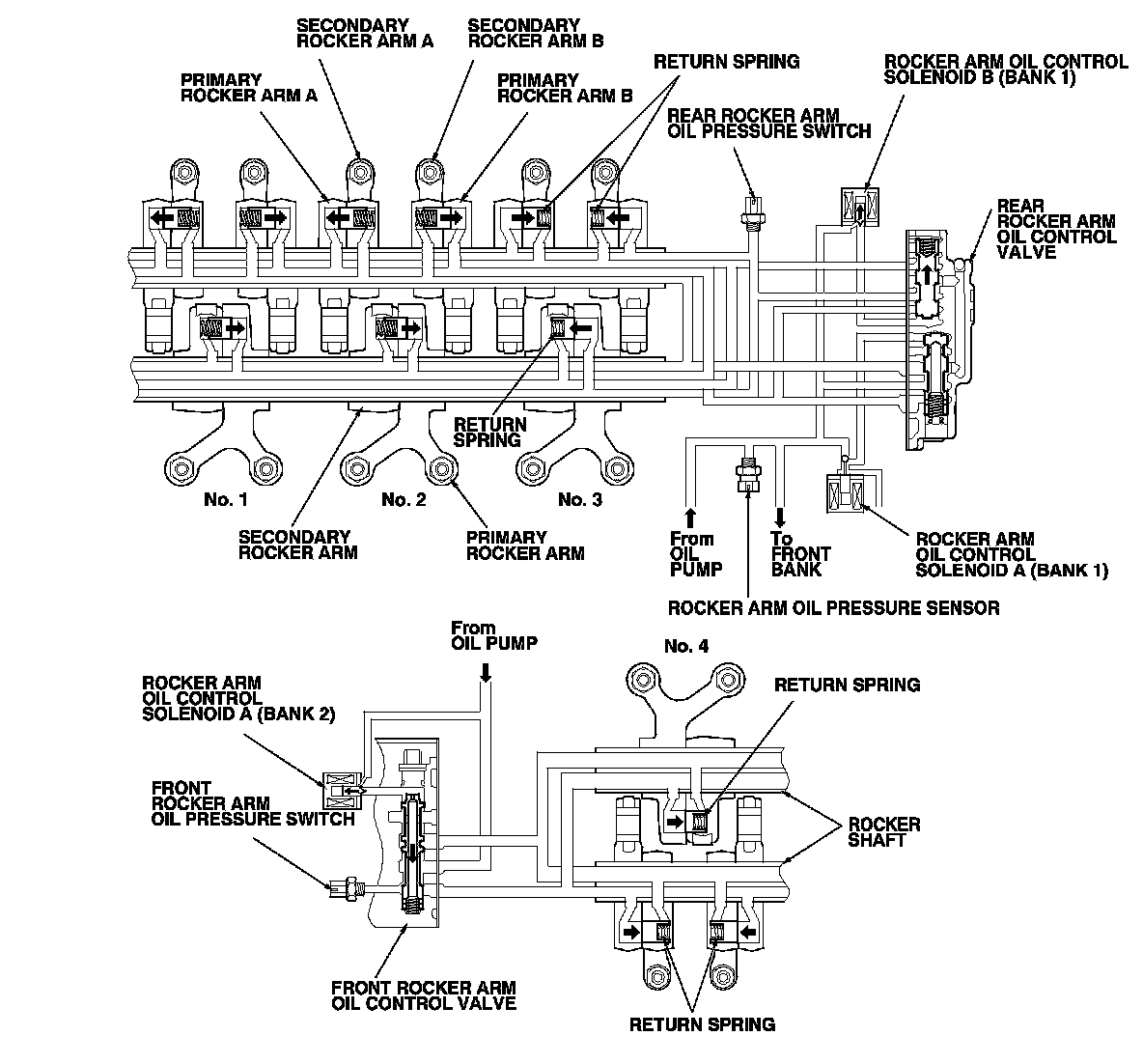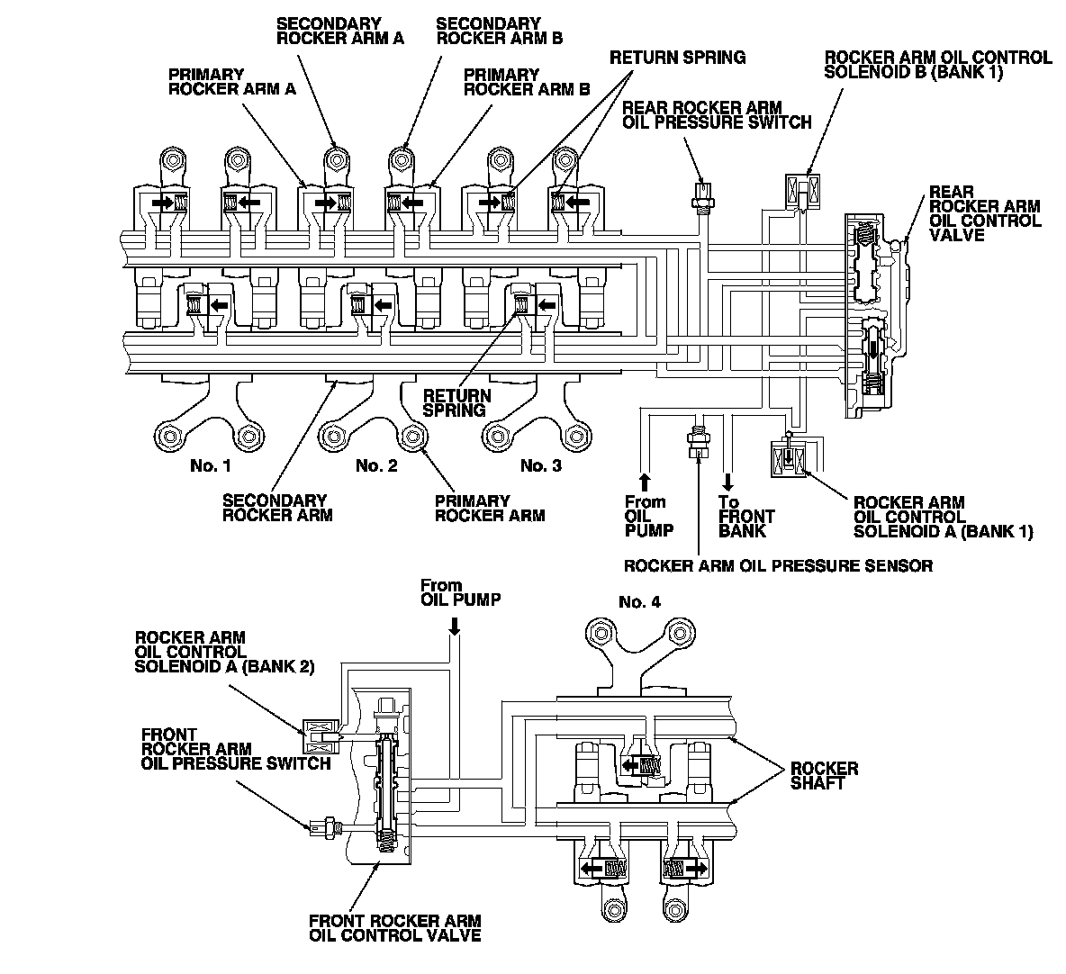 When rocker arm oil control solenoid B (Bank 1) is turned on by the PCM, the rear rocker arm oil control valve switches the oil pressure. Oil pressure then enters the rear bank cylinder's primary rocker arm from the oil passage in the rocker shaft, causing the VTEC switching piston to slide into the secondary rocker arm and against the return spring. This disengages the primary rocker arm from the secondary rocker arm to stop valve activation. The rear bank cylinder's rocker arms do not move, and rear bank cylinders are paused. At the front bank, oil pressure from the front rocker arm oil control valve locks the No. 4 cylinder's primary and secondary rocker arms together. The No. 4 cylinder's rocker arms are moved by the camshaft, and the all front bank cylinders are active.