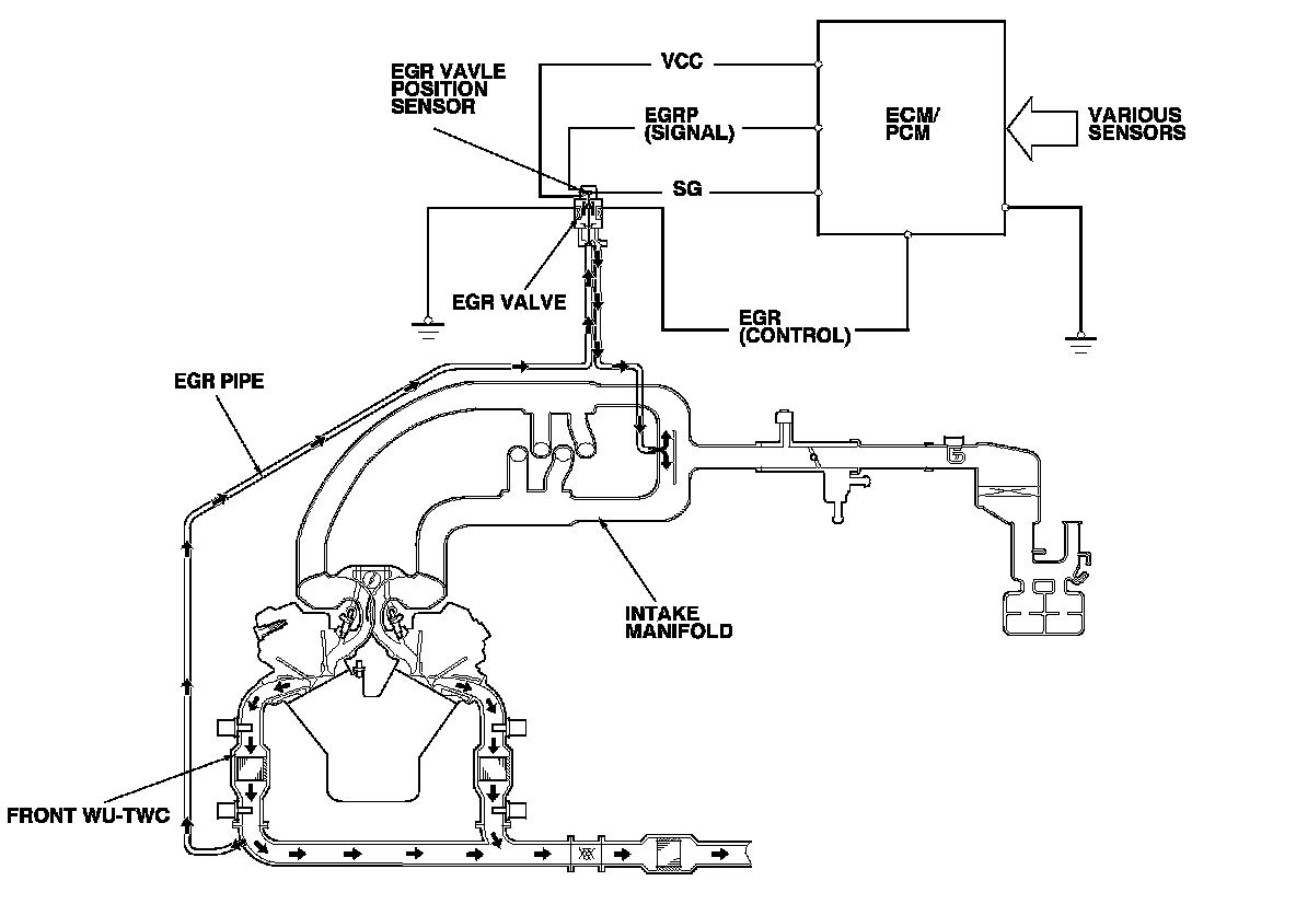 The EGR system reduces oxides of nitrogen (NOx) emissions by recirculating exhaust gas through the EGR pipe and the intake manifold, and into the combustion chambers. Routing the exhaust gas through the EGR pipe helps to prevent carbon deposits from forming in the intake manifold and the throttle body. The ECM/PCM memory includes the ideal EGR valve position for varying operating conditions.