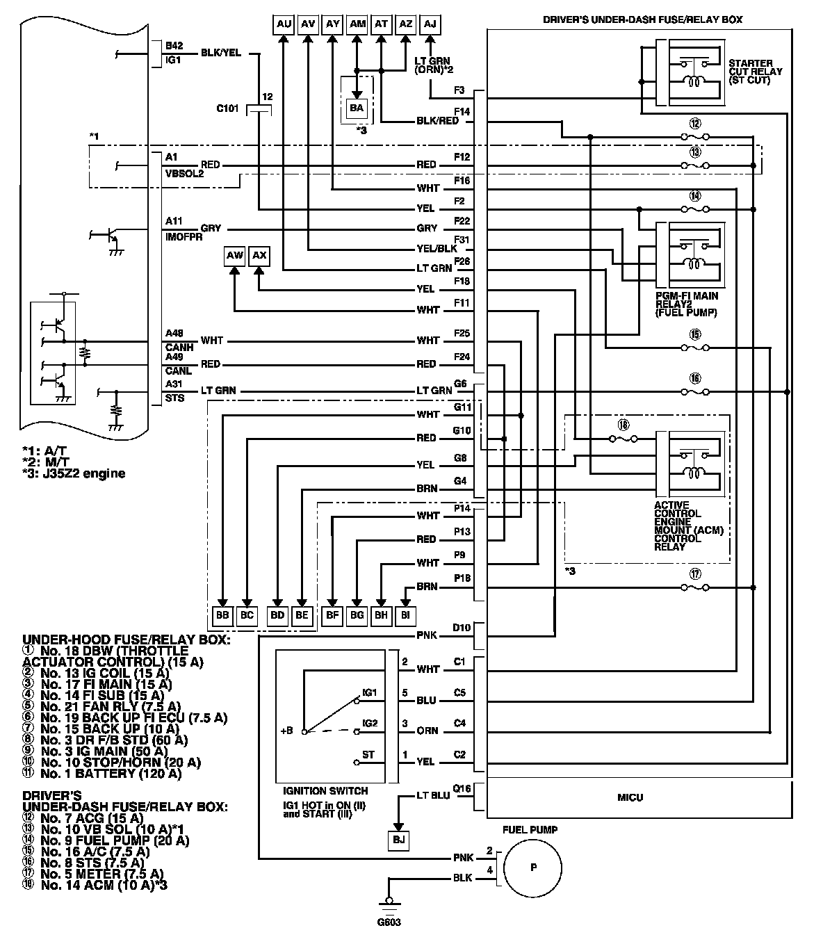 PGM-FI main relay 1 is energized whenever the ignition switch is ON (II) to supply battery voltage to the ECM/PCM, power to the injectors, and power for PGM-FI main relay 2 (FUEL PUMP). PGM-FI main relay 2 (FUEL PUMP) is energized to supply power to the fuel pump for 2 seconds when the ignition switch is turned to ON (II), and when the engine is cranking or running.