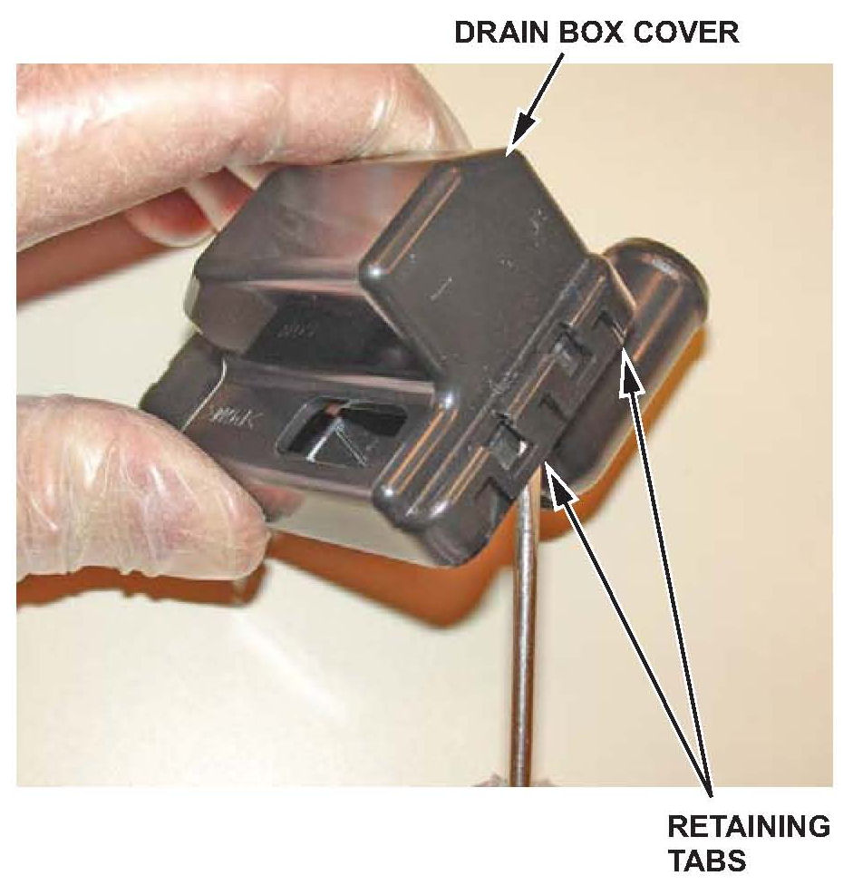If any of the drain box cover retaining tabs are damaged or broken, replace the drain box.