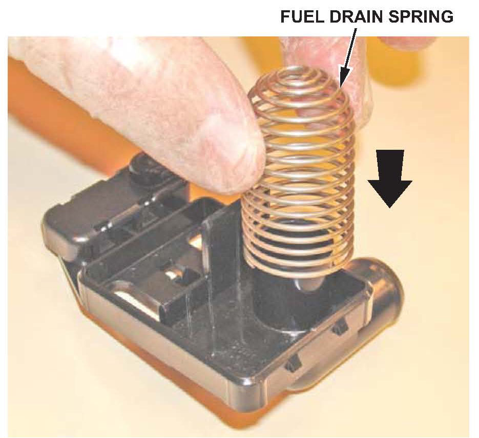 6. Install the fuel drain spring over the EVAP vent hose port in the drain box as shown, then reinstall the drain box cover.