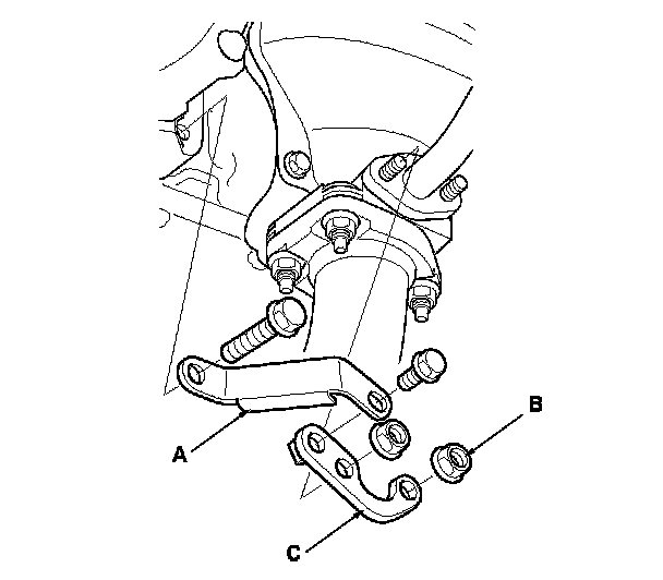 3. Temporarily install the front WU-TWC stay joint (A) and the front WU-TWC stay (B). Tighten the EGR pipe mounting nuts (C) and the bolts by hand.