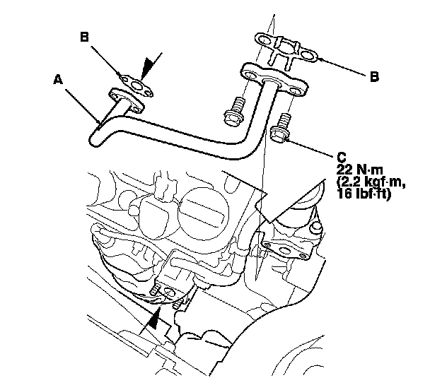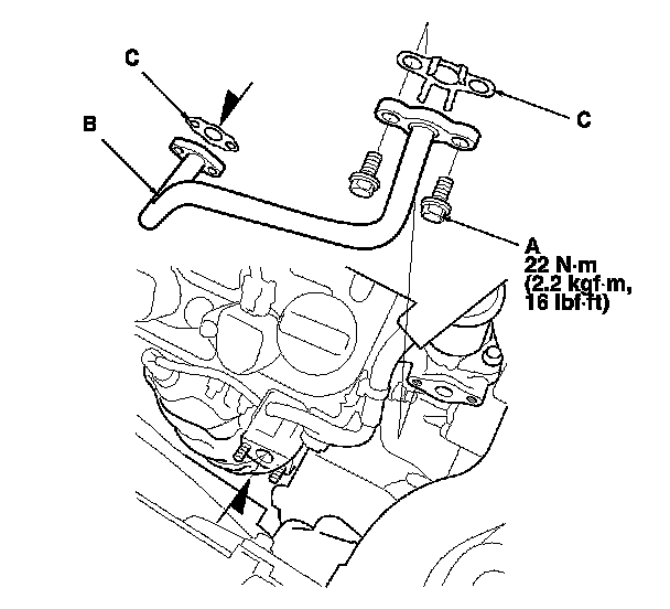1. Set the EGR pipe (A) with new gaskets (B), and tighten the EGR pipe mounting bolts (C).