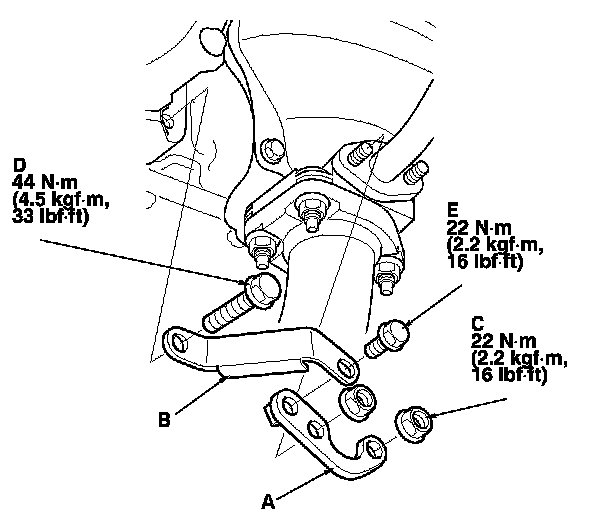 5. Tighten the A/C compressor bracket mounting bolt (D), then tighten the bolt (E).